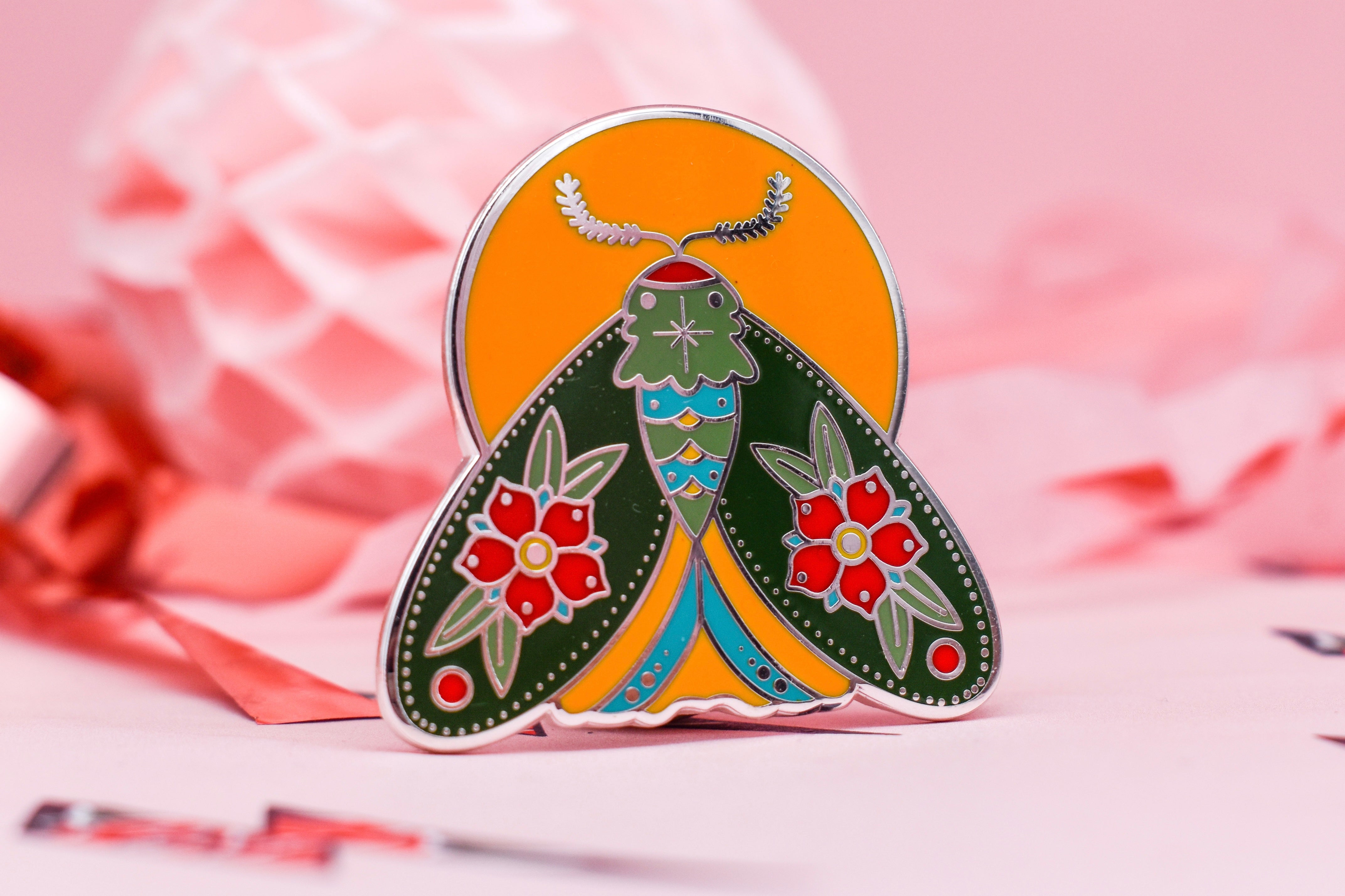 Rosey Moth Hard Enamel Pin | Tattoo Flash Moth with Red Roses