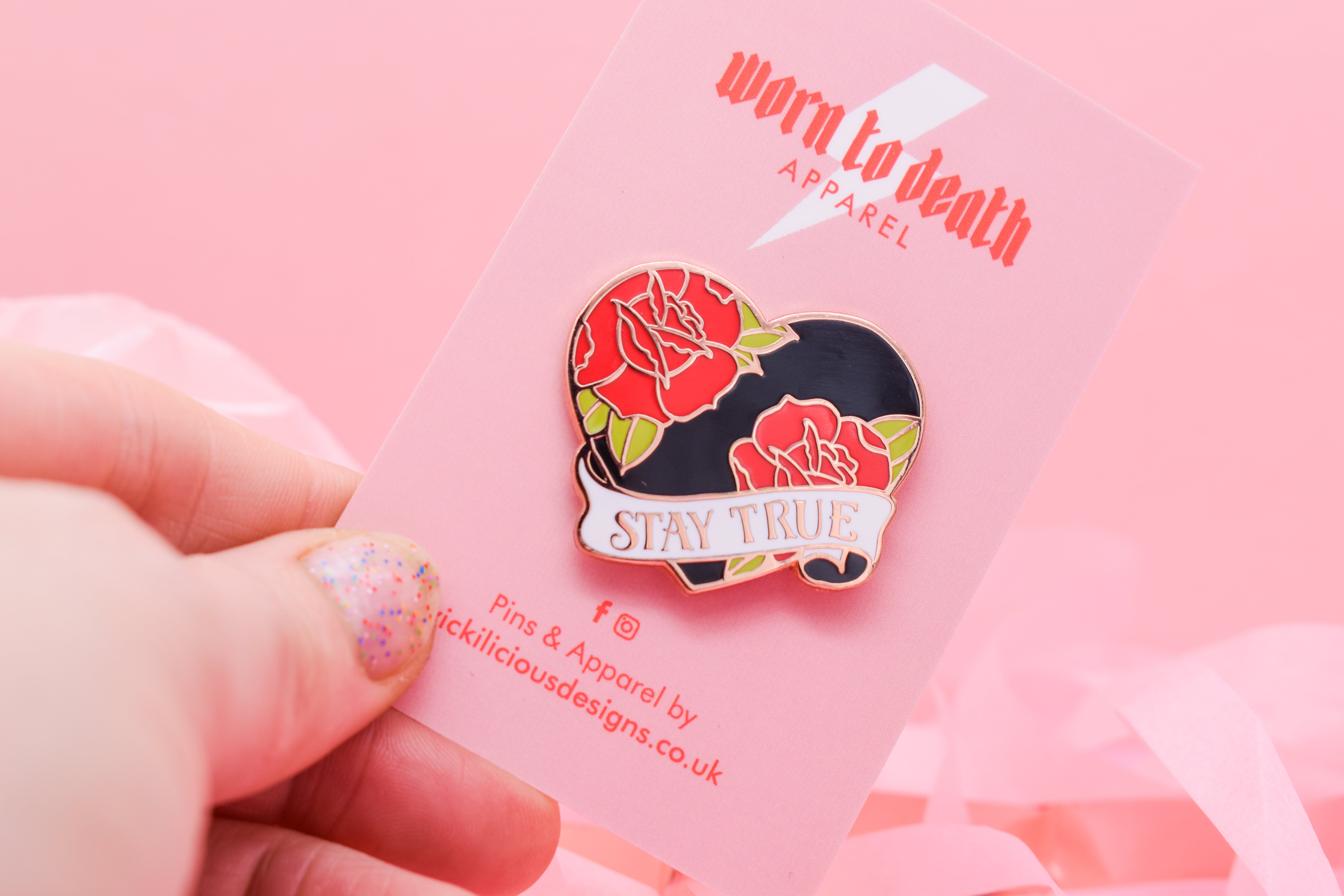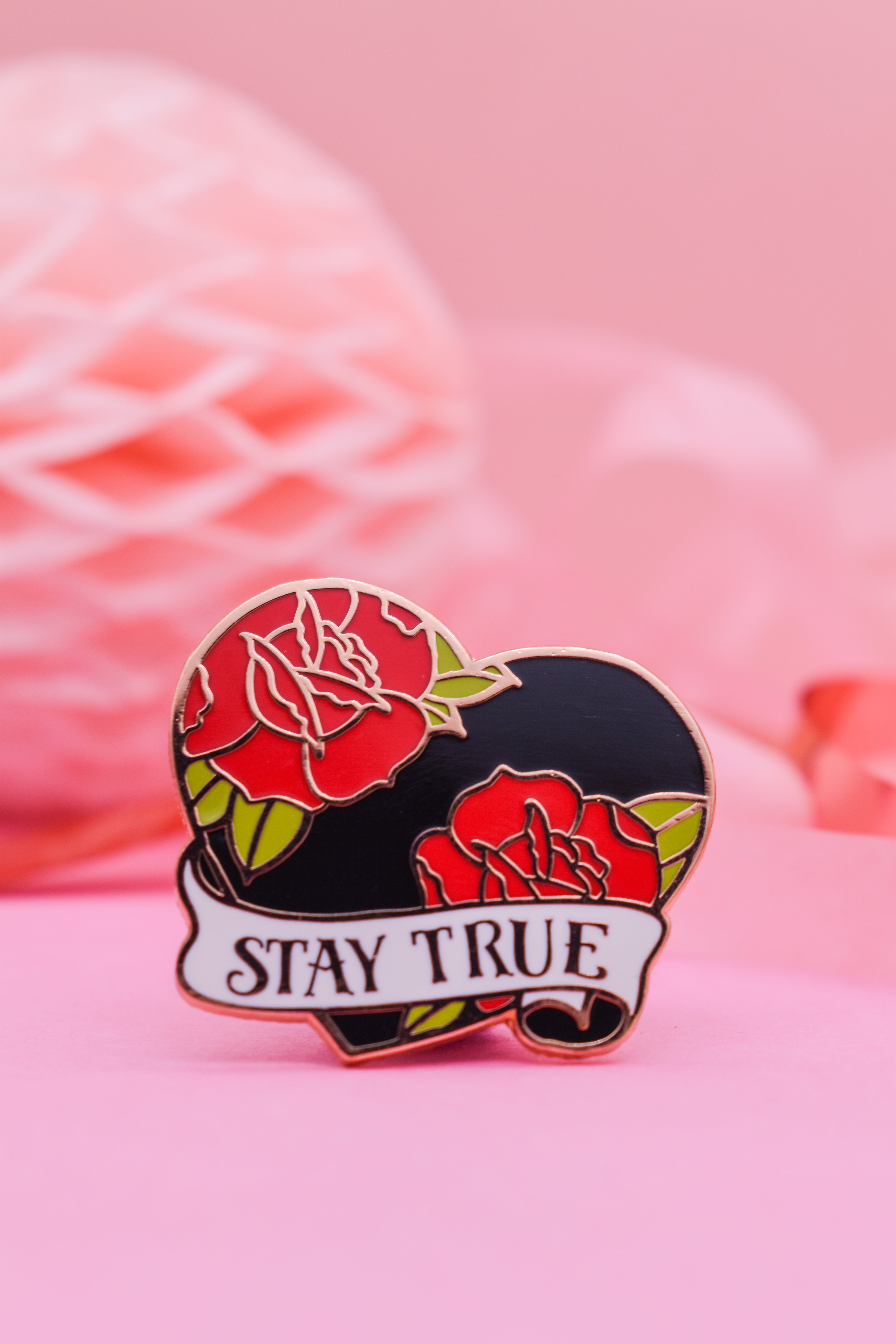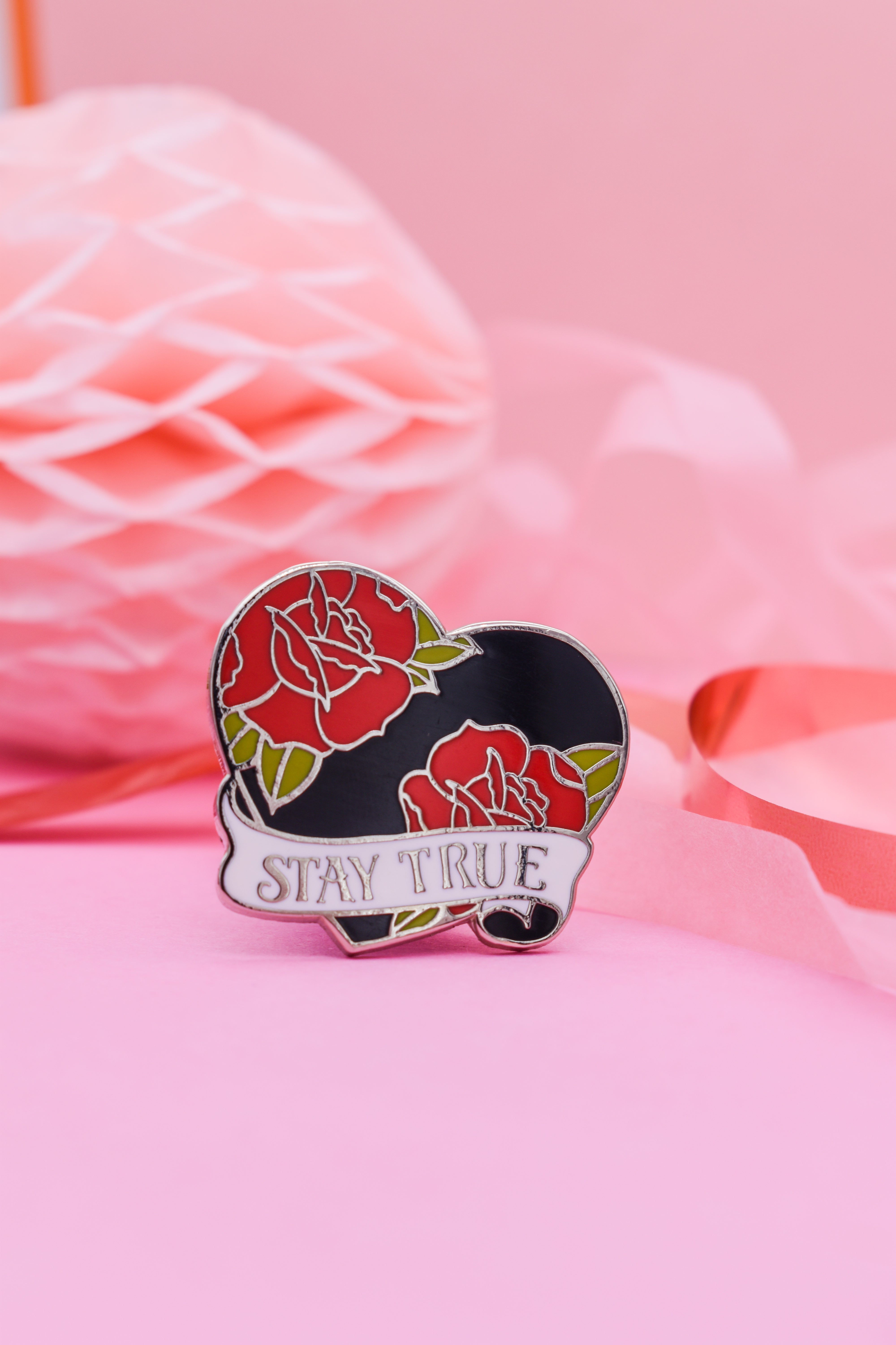 Wear your heart on your sleeve—literally—with this Stay True tattoo-style enamel pin from the Ink & Blood Rosecollection.Featuring a bold black heart wrapped in red roses and finished with a...