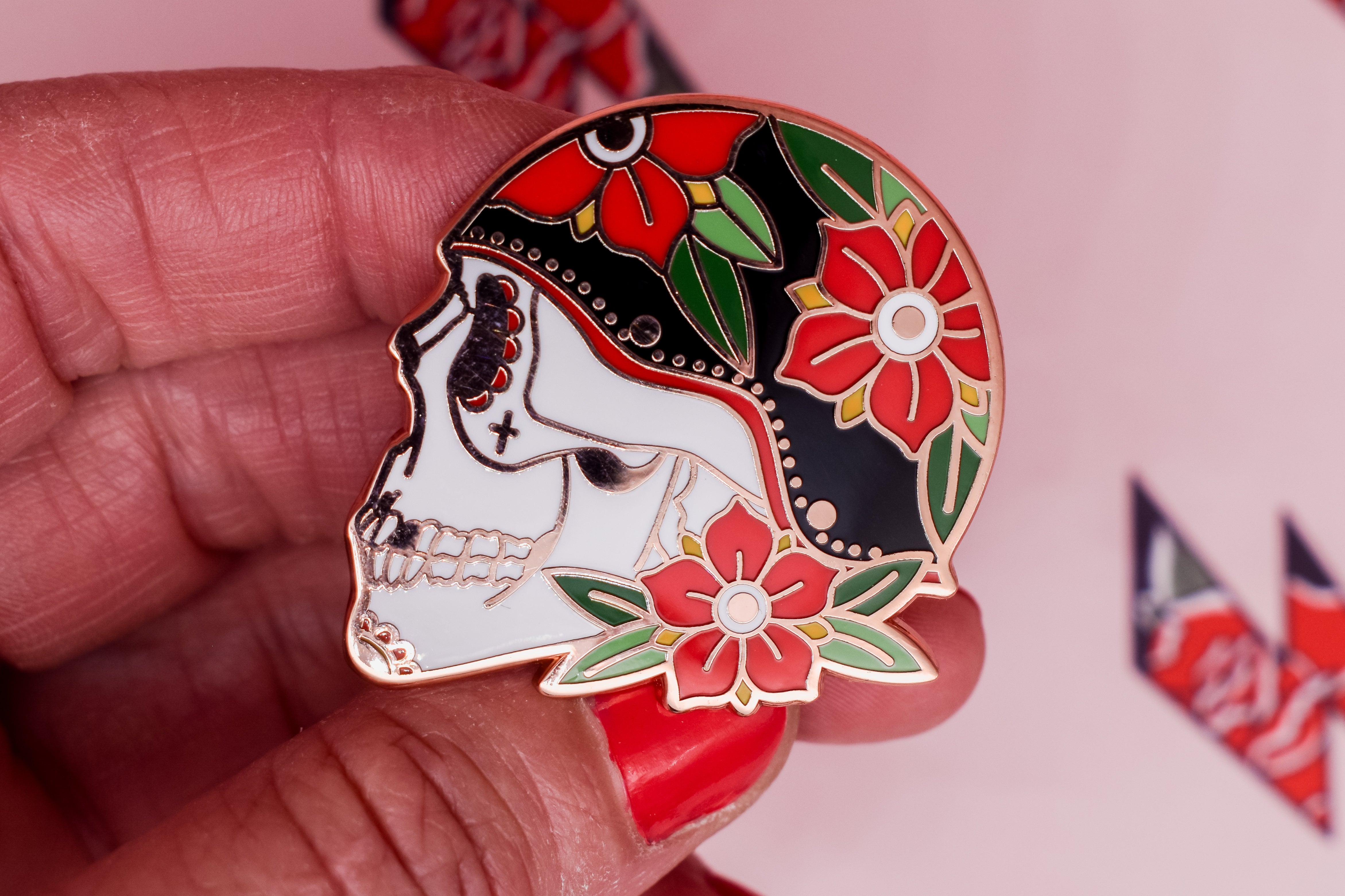 My Skulls & Roses pin is part of my Kickstarter project Ink & Blood Rose this hard enamel pin features my tattoo illustration of a skull decorated with blood red roses. For...
