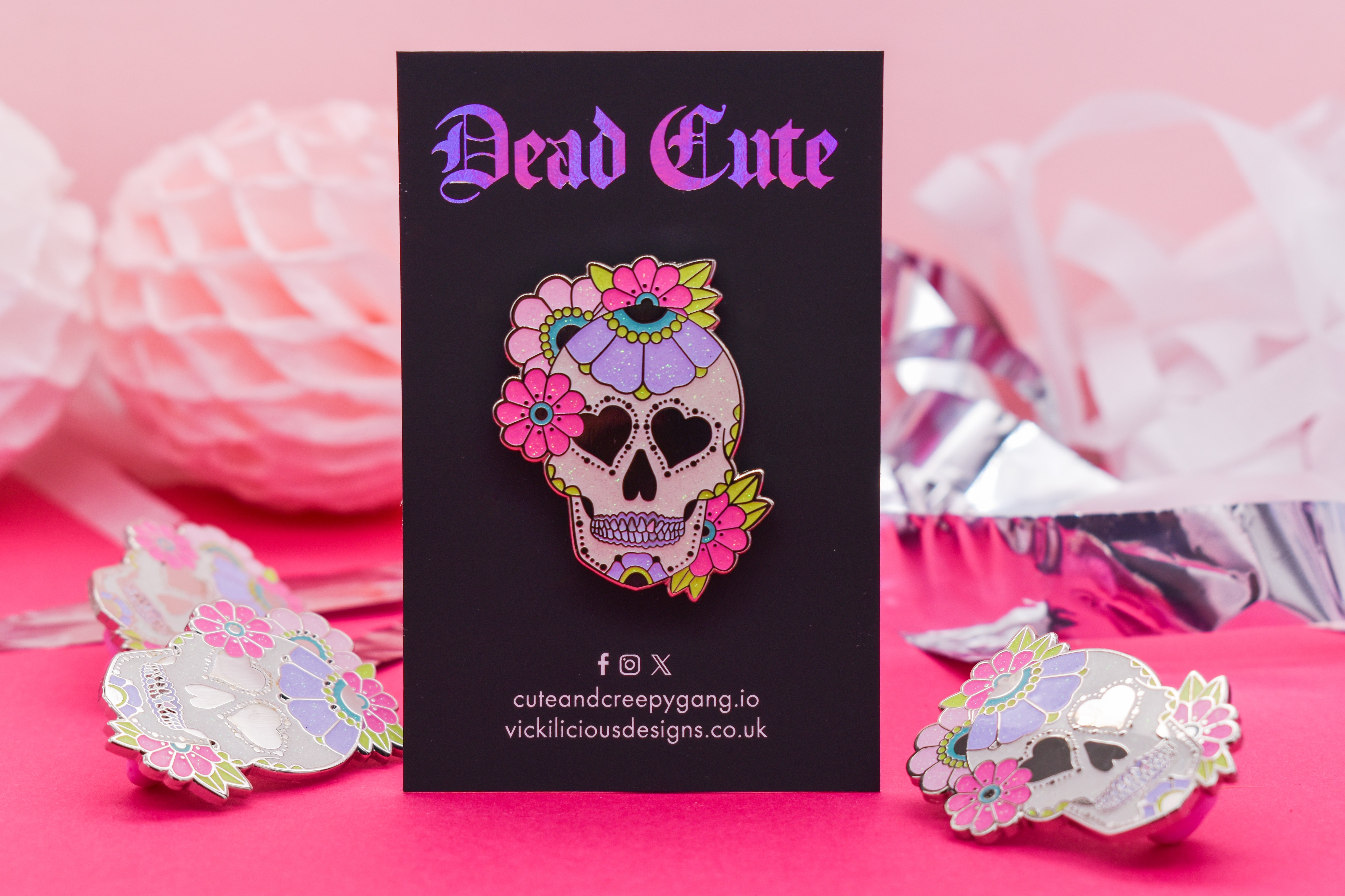 Meet your new dead beautiful accessory. This pastel sugar skull enamel pin is bursting with cute-and-creepy charm — from its blooming pink and lilac daisies to those shiny heart-shaped eyes...